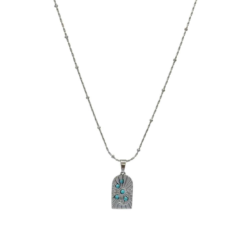 Απογειώστε το στυλ σας με αυτό το κομψό κολιέ από ατσάλι, ιδανικό για καθημερινή χρήση αλλά και πιο ιδιαίτερες εμφανίσεις. Το χρυσό μενταγιόν διαθέτει χαραγμένες λεπτομέρειες και μικρές τιρκουάζ πέτρες που προσθέτουν μια διακριτική, boho πινελιά. Ανθεκτικό, αντιαλλεργικό και διαχρονικό, αποτελεί την τέλεια επιλογή για δώρο ή για να συμπληρώσει τη δική σας συλλογή. Μήκος Αλυσίδας: 40εκ. Προέκταση: 5 εκ.